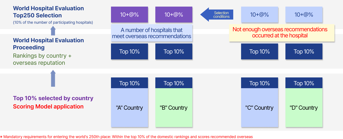 National ranking + International reputation reflected (Top 10% hospitals selected in each country, then global ranking adjusted based on international recommendations)