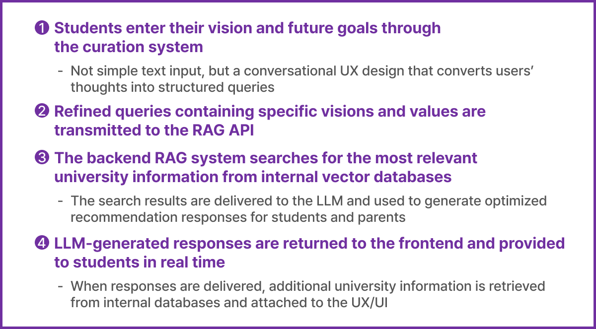 Inistitute of University Evaluation Inc. operates a generative AI platform by developing the real-time university selection AI solution Anchor software platform, integrating our domestic university evaluation models and results, publicly available QS/THE world university ranking data, university specialization strategies, and IPO (Input-Process-Output) capability big data, in collaboration with ChatGPT LLM (Large Language Model) and RAG (Retrieval Augmented Generation) systems. Through this, students and parents worldwide can continuously explore universities and ultimately select the optimal preferred university aligned with the student’s vision and future value.