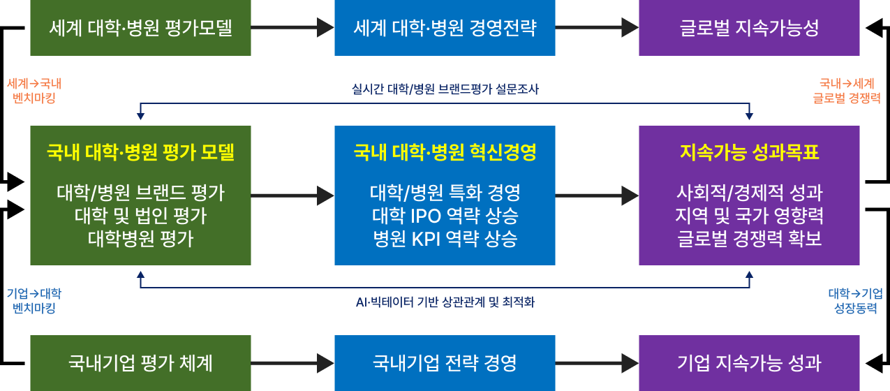 국내 대학(병원)이 세계 리더 보드에 오르기 위해 투명하고 공정한 평가모델과 피드백이 선순환되는 과정에서 브랜드 인지도와 글로벌 평판도의 효과적인 개발은 커다란 관건이 될 것이다. 대학평가연구원(주)은 대학평가에서 병원평가까지 모든 과정을 민간주도의 실시간 디지털 플랫폼으로 구현하여 국내 대학/법인/병원의 전략적 브랜딩을 위한 핵심적 선도 역할을 해 나갈 것이다.