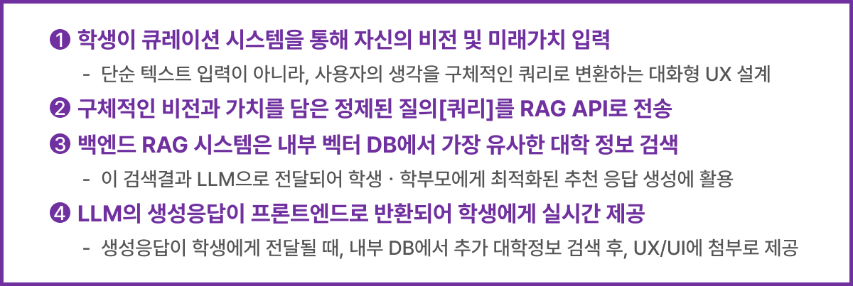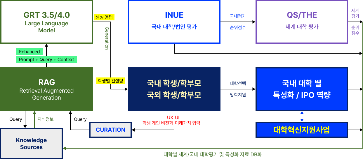 대학평가연구원(주)은 실시간 대학선택 AI 솔루션 앵커(Anchor) 소프트웨어 플랫폼을 개발하여 당사의 국내 대학평가 모델 및 결과, QS/THE 세계대학평가 공개자료, 대학별 특성화 전략 및 IPO(Input-Process-Output) 역량 관련 빅데이터를 기반으로 Chat GPT LLM(Large Language Model) 및 RAG(Retrieval Augmented Generation) 시스템과 협업하는 생성형 AI 플랫폼을 운영한다. 이를 통해 국내외 학생과 학부모들이 대학을 선별하려는 시도를 지속할 수 있게 함으로써, 학생 자신의 비전과 미래가치에 따른 최상·최적의 선호 대학을 선택할 수 있을 것이다.